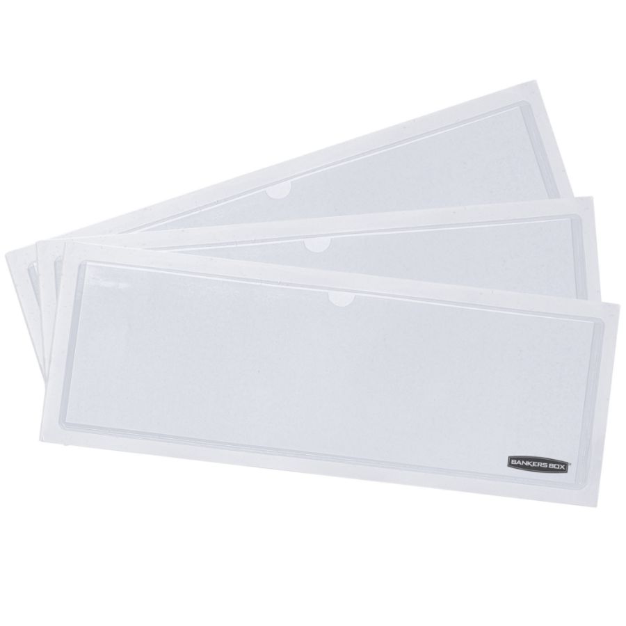 Bankers Box Label Pockets | Grand & Toy DETAILS. Simply slip label into label pocket for quick, easy identification of storage boxes. Self-adhesive label pocket made from clear PVC - won't crack or peel. Perfectly sized to fit labeling area on all Bankers Box storage boxes, sold separately. Easily change the label again and again. Includes 48 white label inserts. 9 1/4" x 3 1/4". Clear.