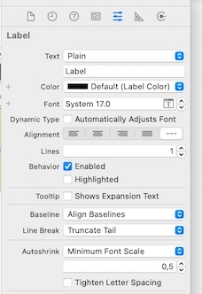 Apple Developer Documentation minimum The minimum scale factor for the label's text. number The maximum number of lines for rendering text. A Boolean value that indicates whether the label adjusts spacing between letters to fit the string within the label's bounds rectangle. Deprecated Apple Developer Documentation Platforms iOS iPadOS macOS tvOS watchOS Tools Swift SwiftUI